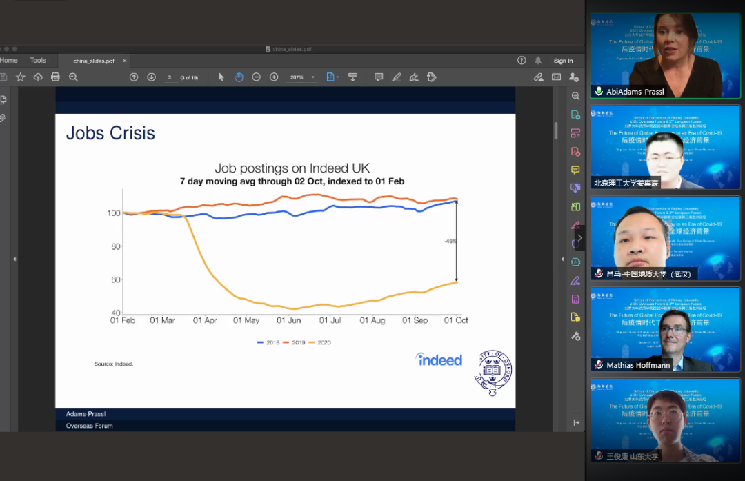 2020年10月17日下午,beat365中文官方网站2020年海外论坛暨第二届欧洲论坛通过线上会议平台顺利举行。英国牛津大学新学院资深研究员、应用微观经济学学术召集人艾比·亚当斯-普拉斯尔(Abi Adams-Prassl)受邀参会并发表题为“新冠疫情与劳动力市场”的演讲。