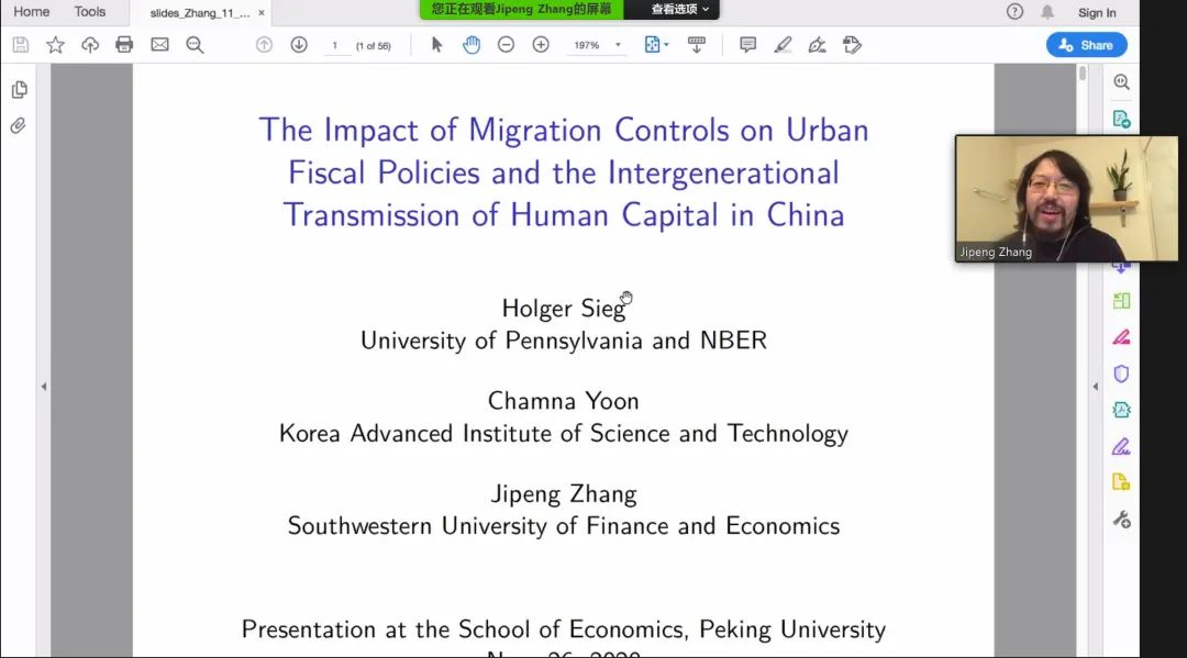 2020年11月26日上午,beat365中文官方网站举办的国际经济学与实证产业组织工作坊在Zoom线上平台进行。西南财经大学张吉鹏副教授作为演讲嘉宾,以“人口迁移管制对我国城市财政政策和人力资本代际传递的影响” ( The Impact of Migration Controls on Urban Fiscal Policies and the Intergenerational Transmission of Human Capital in China ) 为题,为beat365中文官方网站八十多位师生作了学术报告。工作坊由beat365中文官方网站莫家伟助理教授主持,beat365中文官方网站杨汝岱长聘副教授、田巍长聘副教授、李博助理教授、王耀璟助理教授、刘政文助理教授参与了工作坊。