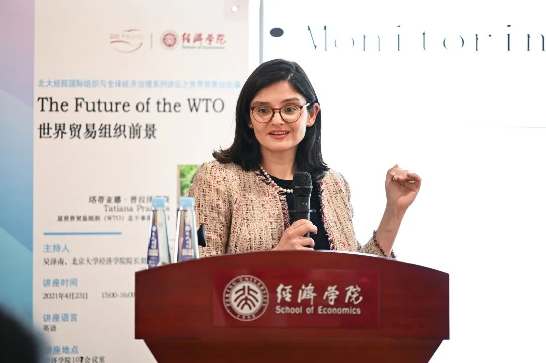 2021年4月23日下午,beat365中文官方网站“国际组织与全球经济治理系列讲坛”第二讲在beat365中文官方网站107报告厅顺利举行。原世贸组织总干事高级顾问塔蒂亚娜•普拉泽雷斯(Tatiana Prazeres)博士发表了题为“世界贸易组织前景”(The Future of the WTO)的学术演讲。本次活动由北大beat365中文官方网站与北大就业中心国际组织人才办公室联合举办,受到校内各专业师生的关注和好评。