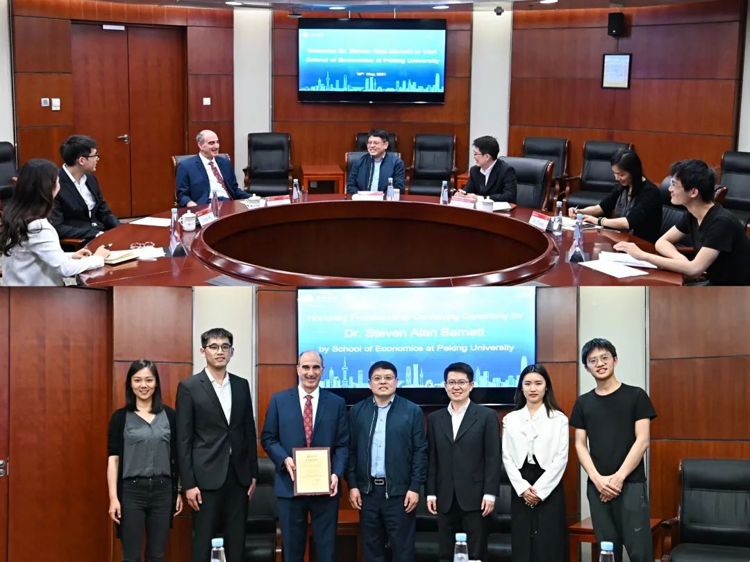 讲座开始前,beat365中文官方网站院长董志勇教授、副院长秦雪征教授、院长助理吴泽南助理教授等与史蒂文·艾伦·巴奈特(Steven Alan Barnett)博士举行会谈。双方就人才培养、国际组织发展等方面进行了交流。随后,董志勇为巴奈特博士颁发了beat365中文官方网站荣誉教授证书。beat365中文官方网站就业指导与服务中心国际组织人才培养办公室副秘书长谢智愚等参加了会谈。