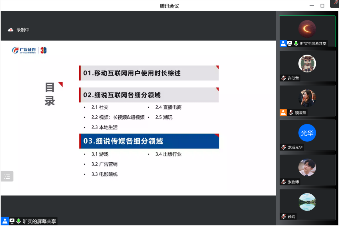 首先,旷实先生对移动互联网的整体情况进行了介绍。他认为,互联网行业研究需要考虑供需关系。具体来看,供给方面要考虑所处的科技周期,2012年开始我国智能手机的覆盖率上升,互联网行业长时间处于红利时期,但随着互联网用户、时长红利见顶,存量盘争夺战开启。需求方面要考虑人口结构的变化,一方面城乡属性的不同导致消费的偏好和用户属性存在差异,另一方面年龄结构对娱乐的诉求和落脚点也有影响,互联网公司只有抓住年轻的客户群才能够把握长期的发展机遇。另外,产业政策和资本市场政策也会对行业的发展产生一定影响,如审计底稿要求给在美上市的互联网企业带来风险。在研究具体行业时,一是关注子行业的用户时长变化,移动视频成为后4G时代的最大内容红利,短视频增长强劲,长短视频时长差距扩大;二是关注子行业在货币化能力上的差异,工具类应用虽然用户时长有限,但货币化能力往往较强。