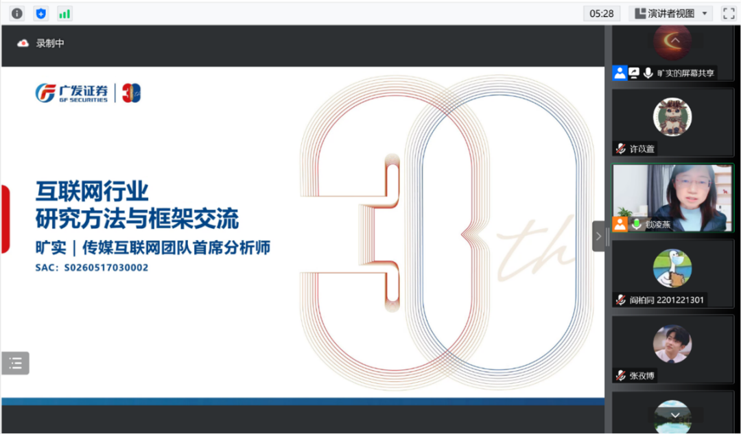 2022年10月18日晚,“行业研究前沿”课程在线上开讲。广发证券传媒互联网行业首席分析师旷实先生受邀作为第三讲的主讲人,以《互联网行业研究方法与框架交流》为题与现场师生进行了深入交流。本次讲座由beat365中文官方网站副院长锁凌燕教授主持,来自beat365中文官方网站及学校其他院系的一百余名研究生同学参加。