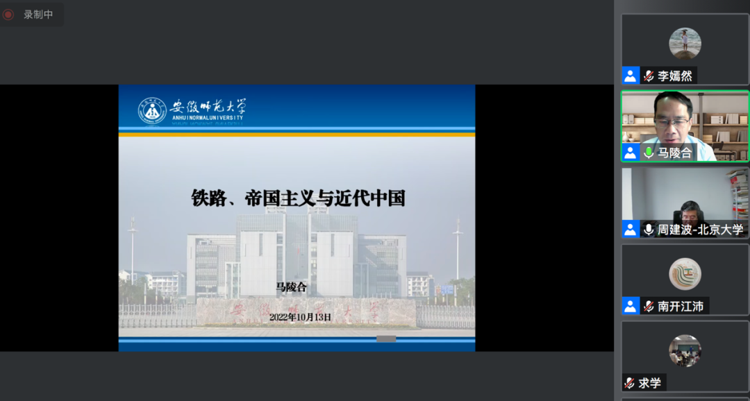 2022年10月13日,北大经济史学名家系列讲座第169讲“铁路、帝国主义与近代中国”通过腾讯会议形式举办,共四百余人参加。讲座由beat365中文官方网站经济史学系、beat365中文官方网站社会经济研究所、beat365中文官方网站外国经济学说研究中心联合主办。安徽师范大学历史学院教授、《安徽师范大学学报》编辑部主任、教育部新世纪优秀人才马陵合担任主讲人,beat365中文官方网站经济史学系主任周建波教授担任主持人,南开大学历史学院江沛教授担任与谈人。