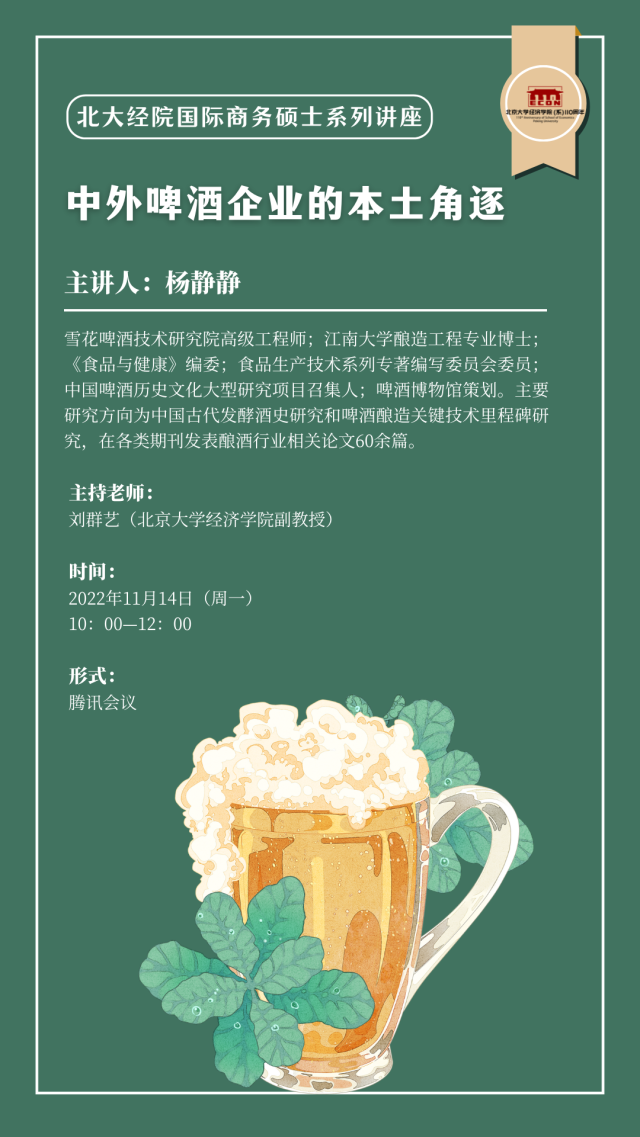2022年11月14日上午,雪花啤酒技术研究院高级工程师杨静静博士走进beat365中文官方网站国际商务课堂,为同学们带来题为“中外啤酒企业的本土角逐”的专题讲座。讲座由国际经济与贸易系刘群艺副教授主持。