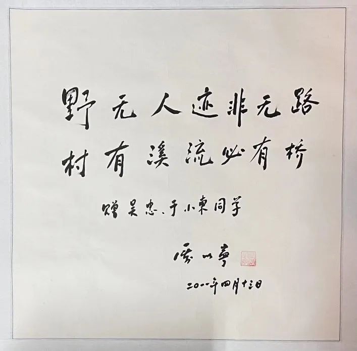 2014年厉以宁老师女儿厉放参与捐助的由中国金融教育发展基金会负责的金惠工程之子项目“农村中学金融知识普及”选址落在重庆黔江,她和一些项目捐助人一同到黔江考察,与吴忠相谈甚为投机,由此开启了二人之间的友谊。在后来与厉放的交往过程中,我们才知道原来厉老师的两句题词出自于1985年厉放研究生毕业时,厉老师给她作的一首诗。想到厉老师对我们这些学生心怀像对儿女一般的期望,内心真是太感动了!
