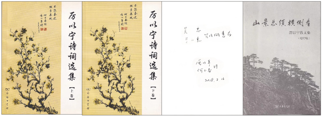 由此我想起厉老师曾经送过我父亲于光远先生一本他写的诗集,记得父亲翻阅时还说厉老师“很有才气”,便回家翻找。但因为父亲的藏书巨多,加之我们搬家过程中几经折腾,父亲去世后又捐赠了大量图书给首都图书馆和上海嘉定档案馆,所以无论如何也找不出来。只好硬着头皮希望厉老师能再赐一本。没想到很快就收到了厉老师和夫人的签名赠书,上面写着“吴忠 于小东 贤伉俪惠存”,这次诗集变成了上下两卷,而且另外还有一本他所著的名为《山景总须横侧看》的散文集,真是喜出望外!
