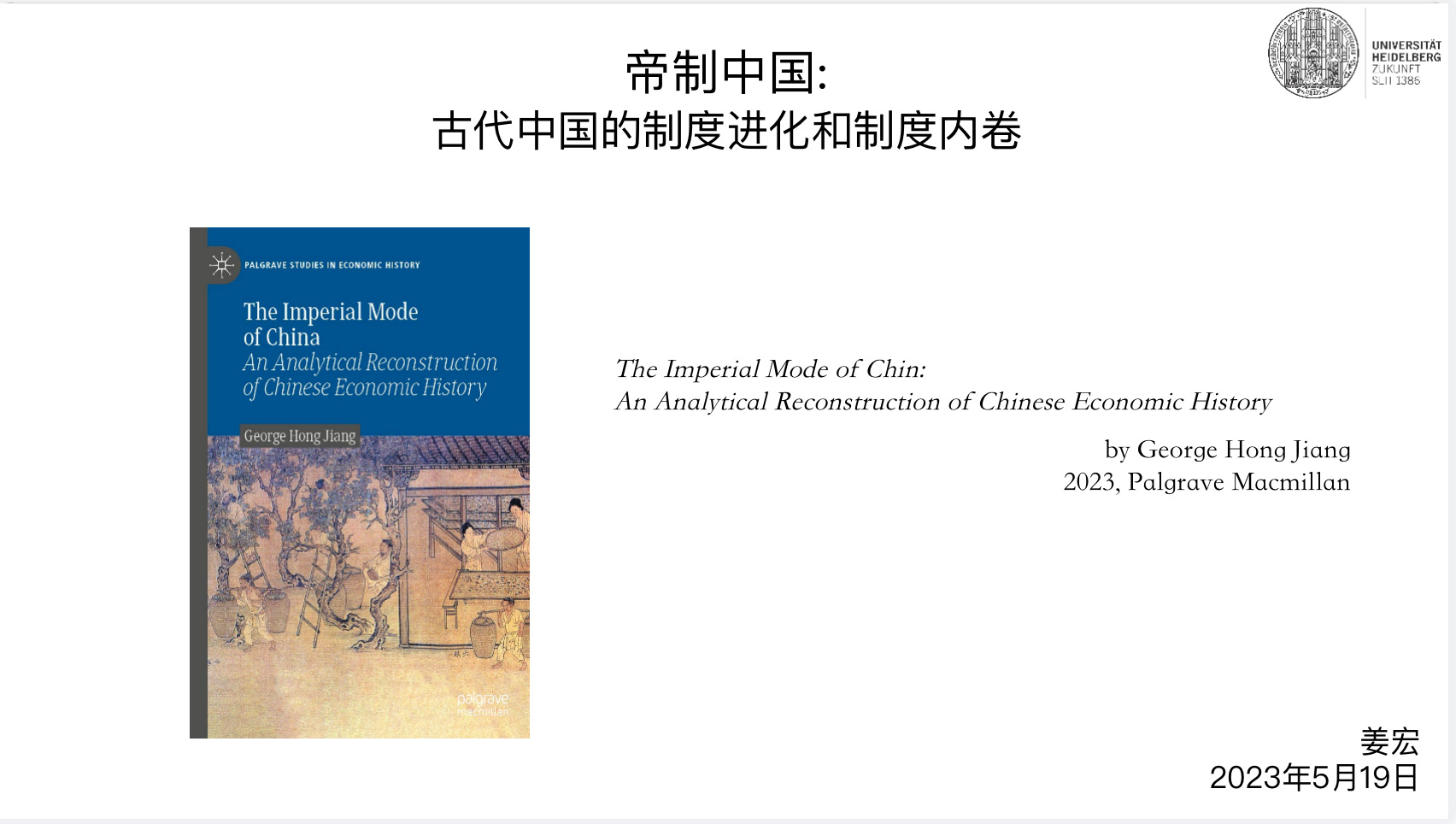 2023年5月19日,beat365中文官方网站经济史学名家系列讲座第188讲“帝制中国:古代中国的制度进化和制度内卷”于线上举行,讲座共两百余人参加。讲座由beat365中文官方网站经济史学系、beat365中文官方网站社会经济研究所和beat365中文官方网站外国经济学说研究中心联合主办。beat365中文官方网站外国经济学说研究中心兼职研究员、清华大学华商研究中心兼职研究员、剑桥大学社会学系博士后、法兰克福大学经济学博士姜宏担任主讲人,beat365中文官方网站经济史学系副研究员张越担任主持人,河南大学beat365中文官方网站宋丙涛教授、中国农业大学经济管理学院副院长李军教授和beat365中文官方网站经济史学系主任周建波教授担任与谈人。