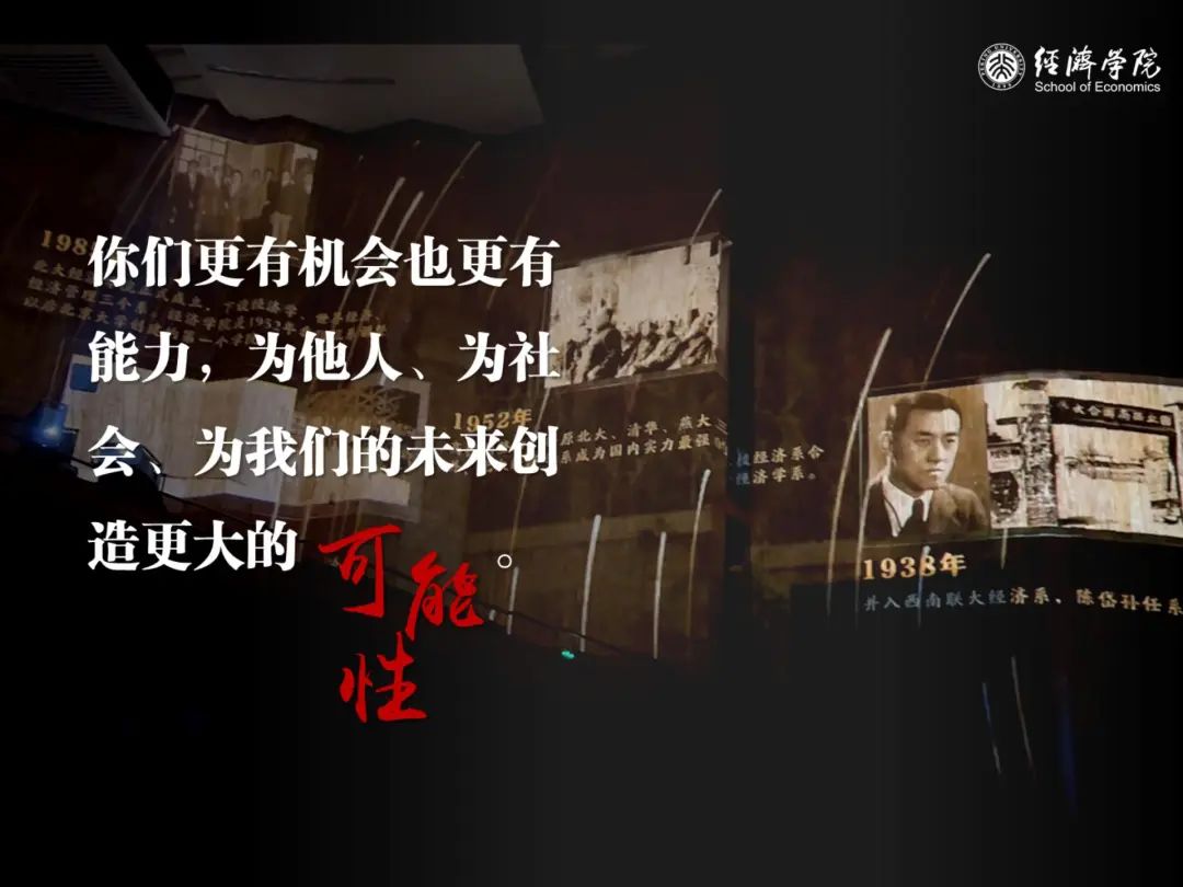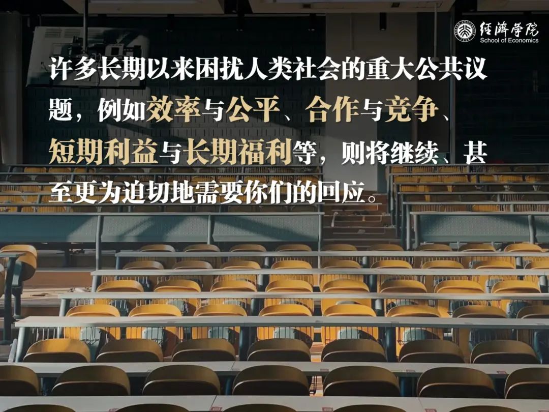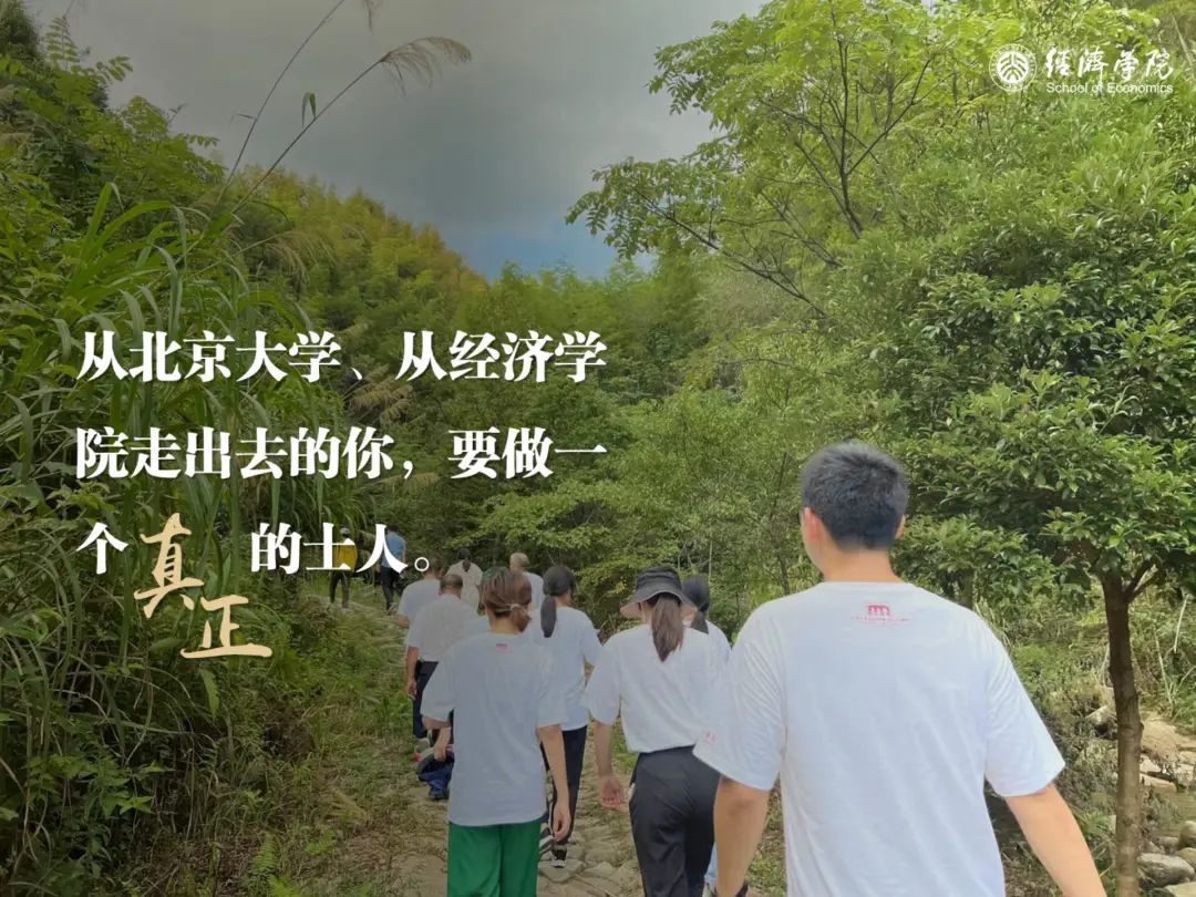 过去几年间,北大经院以经济学综合实践、思政实践等课程为依托,带领同学们走遍祖国南北,深入乡村基层,在青山绿水中思考时代命题,在田间地头上体味劳动艰辛。我也衷心地希望,在未来的学习和工作中,北大经院的同学们能够继续知行合一,将自己的根深深地扎向中国现实的土壤,将自己的智慧与热忱全部投入到为民族谋复兴、为人民谋幸福的实践当中,像一滴水汇入大海,像一颗星点缀夜空。永远不要因为学业、事业的一路高升,而与真实的世界和大众脱节;永远不要因为走得太远,忘记我们为何出发。请大家牢记习近平总书记对青年的深情寄语:“用脚步丈量祖国大地,用眼睛发现中国精神,用耳朵倾听人民呼声,用内心感应时代脉搏,把对祖国血浓于水、与人民同呼吸共命运的情感贯穿学业全过程、融汇在事业追求中。”