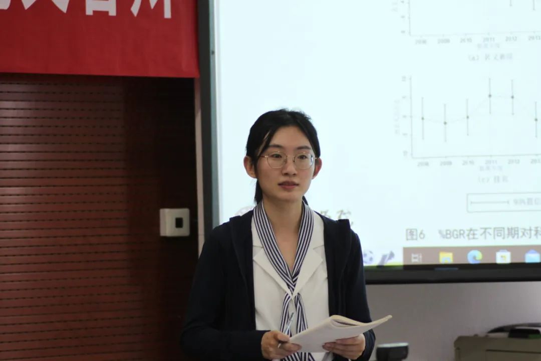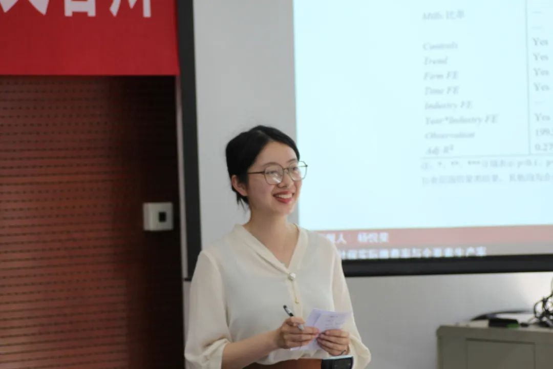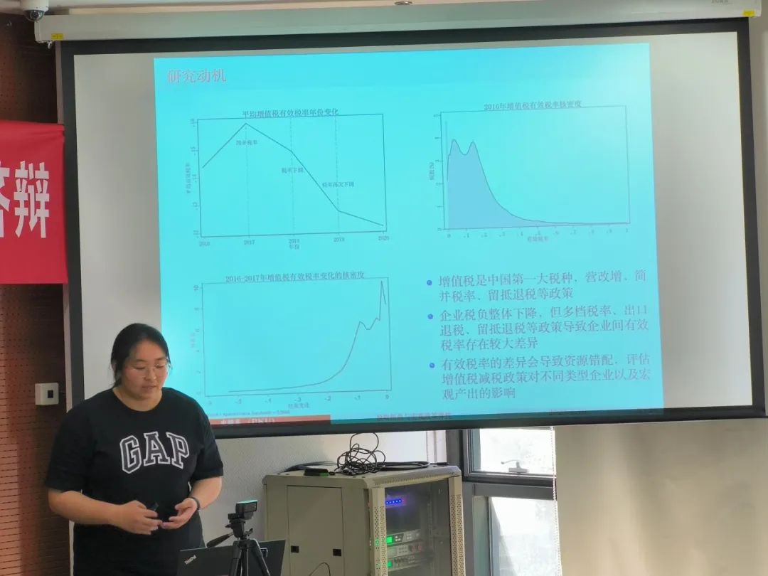 2021级博士生史晨菲汇报了论文《税收扭曲与宏观政策弹性:基于增值税减税视角》。文章通过构建结构模型,给出增值税减税后,税收扭曲变化对微观企业和宏观行业产出影响的表达式,并从实证上识别增值税简并税政策带来的扭曲变化。在点评环节,评审老师们建议更加直观地展示税收扭曲在不同行业的分布情况,以及考虑产业之间的联系可能会对效率损失产生影响。