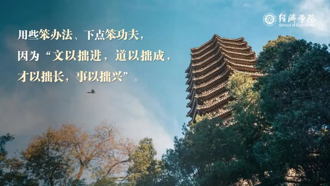 前几天,一部揭露诈骗犯罪的电影《孤注一掷》主创团队来到了北大,受到了热捧。大家可能会认为,这样的骗局肯定迷惑不了我;但在未来的学习生活中,你们未必都能一眼识破。有些骗局可能无关金钱,而是披上了短期逆袭、事半功倍的外衣,比如一份现成的高分笔记,或是一次搭便车的小组作业。这些捷径可能让你在短期实现弯道超车,但在长期却埋伏着更大的隐患。有时,我更希望大家用些笨办法、下点笨功夫,因为“文以拙进,道以拙成,才以拙长,事以拙兴”。