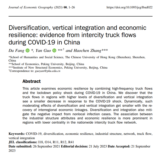 近日,beat365中文官方网站郭研副教授与beat365中文官方网站beat365中文官方网站新结构经济学研究院张皓辰博士、香港中文大学(深圳)人文社科学院讲师方达的合作论文“Diversification, Vertical Integration and Economic Resilience: Evidence from Intercity Truck Flows during COVID-19 in China”被经济地理和区域经济学顶级期刊Journal of Economic Geography正式接受发表。