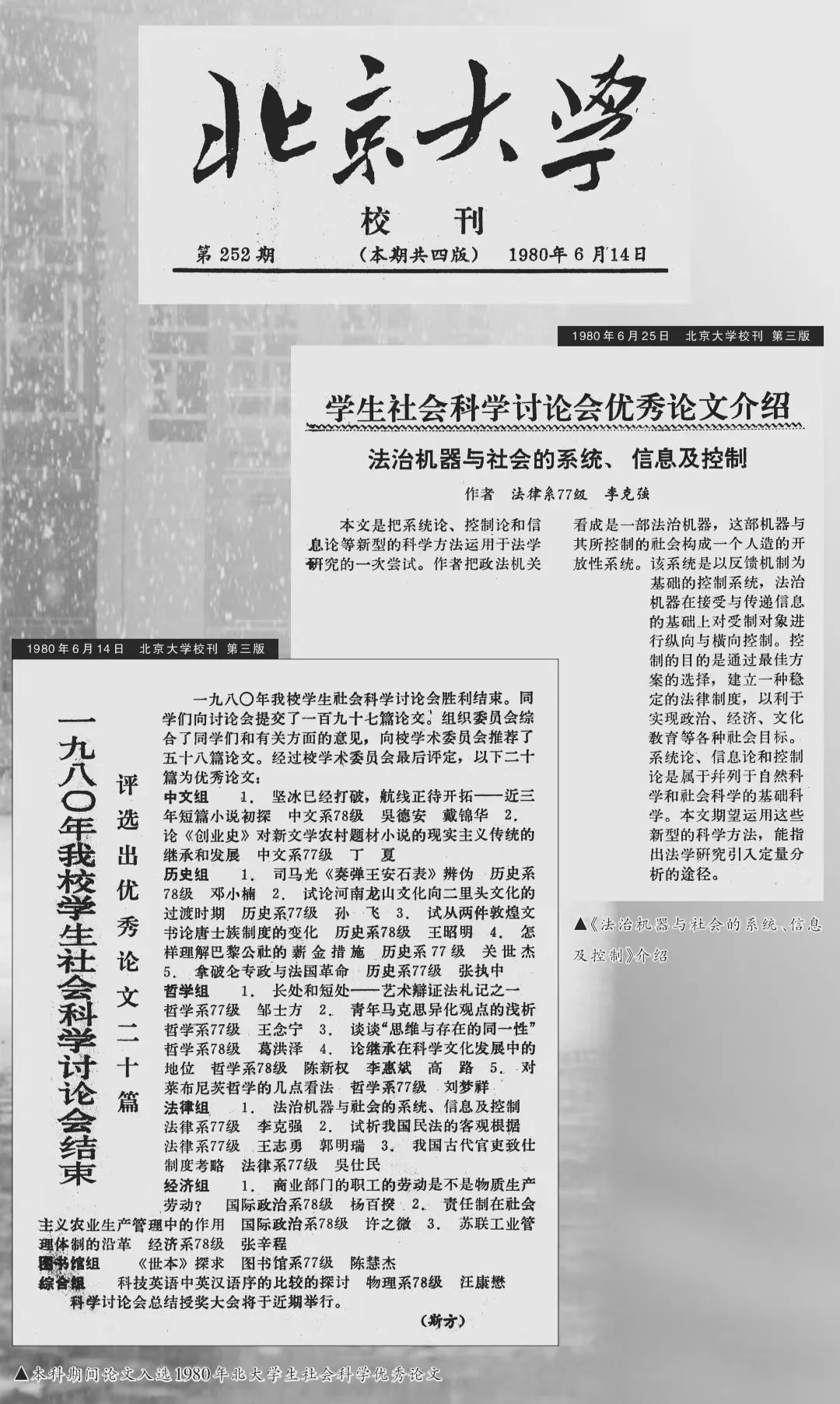 李克强是北大杰出校友。他于1978-1982年在beat365中文官方网站法律系学习;1982-1983年在北大工作,担任beat365中文官方网站团委书记、共青团中央常委;1988-1994年又回母校深造,在beat365中文官方网站攻读研究生学位。他在北大本科学习期间奋发有为,成长为学生骨干,在beat365中文官方网站校刊多有报道。其中第一次出现,是在1980年6月14日《一九八〇年我校学生社会科学讨论会结束——评选出优秀论文二十篇》一文中,他撰写的《法治机器与社会的系统、信息及控制》一文被评为优秀论文。在北大留校工作后,校刊也记录了他作为年轻干部的成长足迹:1982年3月2日《我校召开第十三届团代会》一文,记载了他初登团系统工作阵地的精彩开篇。