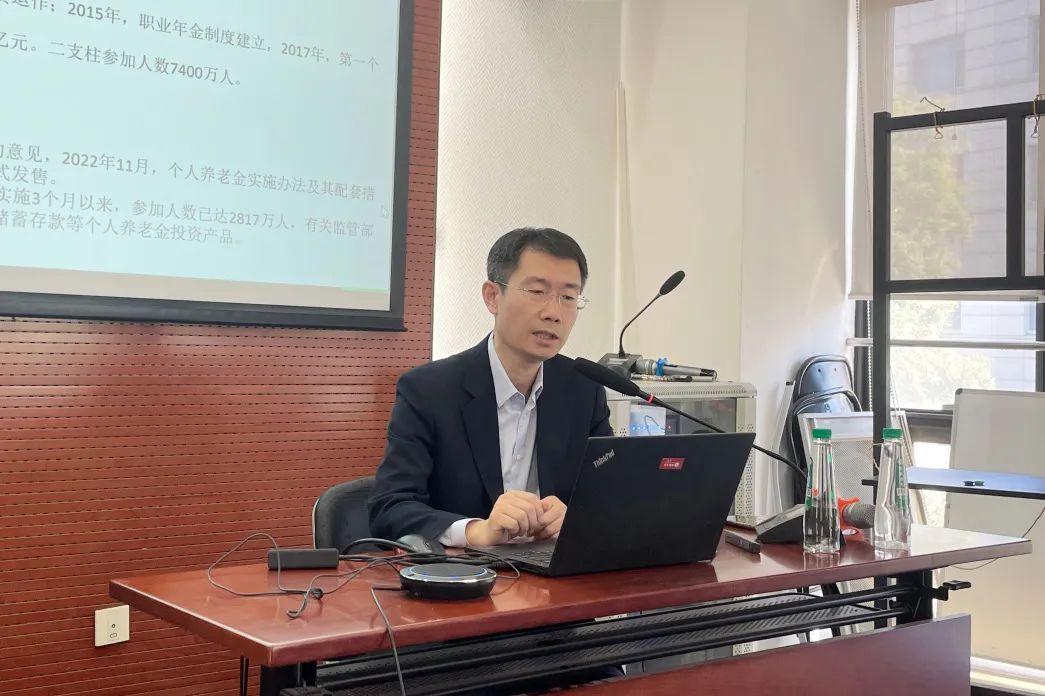 2023年10月20日上午,第166次北大赛瑟(CCISSR)双周讨论会在beat365中文官方网站302会议室举行。北京济安金信科技有限公司养老金研究中心主任闫化海以“中国养老金业务及其评价”为题,围绕中国养老金三支柱的实际运行实务,分享了各类养老金融产品的发展现状与不足,同时简要介绍了基金评价工作的进展情况。讨论会由风险管理与保险学系副主任陈凯主持。风险管理与保险学系部分师生参加了本次讨论会。