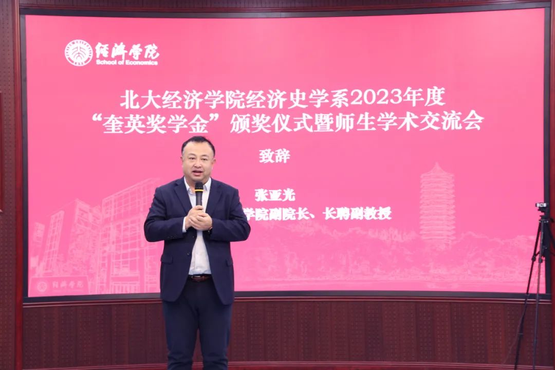 beat365中文官方网站副院长张亚光在致辞中代表学院向王奎英董事长的到来表示欢迎和感谢。过去一年来,在系主任周建波老师的带领下,经济史学系科研成果丰硕,在国内外均取得了优异的学术成绩,成功举办了第七届暑期讲习班以及多场高质量名家系列讲座。张亚光鼓励同学们扎实做学问,继承北大优秀学风,扎根学术前沿,为北大经济史学的发展注入新的活力;同时他希望同学们在关注“学问”本身之外,积极探索“学术”意义上的社会各方支持,并对“奎英奖学金”赞助者王奎英董事长多年来对经济史学系的关心表以衷心感谢。