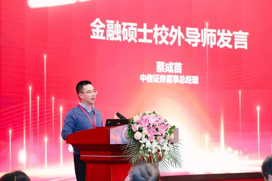 随后,五个专业硕士点的校外导师代表依次发言。金融硕士校外导师、中信证券董事总经理蔡成苗作为导师代表发言。他表示,自己很荣幸能够参与到学生的学业职业发展道路中。蔡成苗认为,在学生面对选择和不确定性的迷茫时,校外导师可以帮助学生在获取专业知识之外,提高沟通、协作能力,少走弯路,从而助力学生在未来的全球金融市场有所作为。