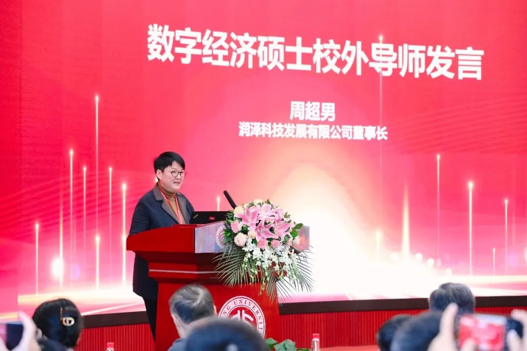 数字经济硕士校外导师、润泽科技发展有限公司董事长周超男表示,数字经济已成为推动建设现代化产业体系、推动构建新发展格局的关键力量。她深刻赞同设置数字经济硕士专业学位授予点,并鼓励同学们克服对人工智能的恐惧感,在数字经济高质量发展的背景下,把握时代机遇,磨砺自身能力。