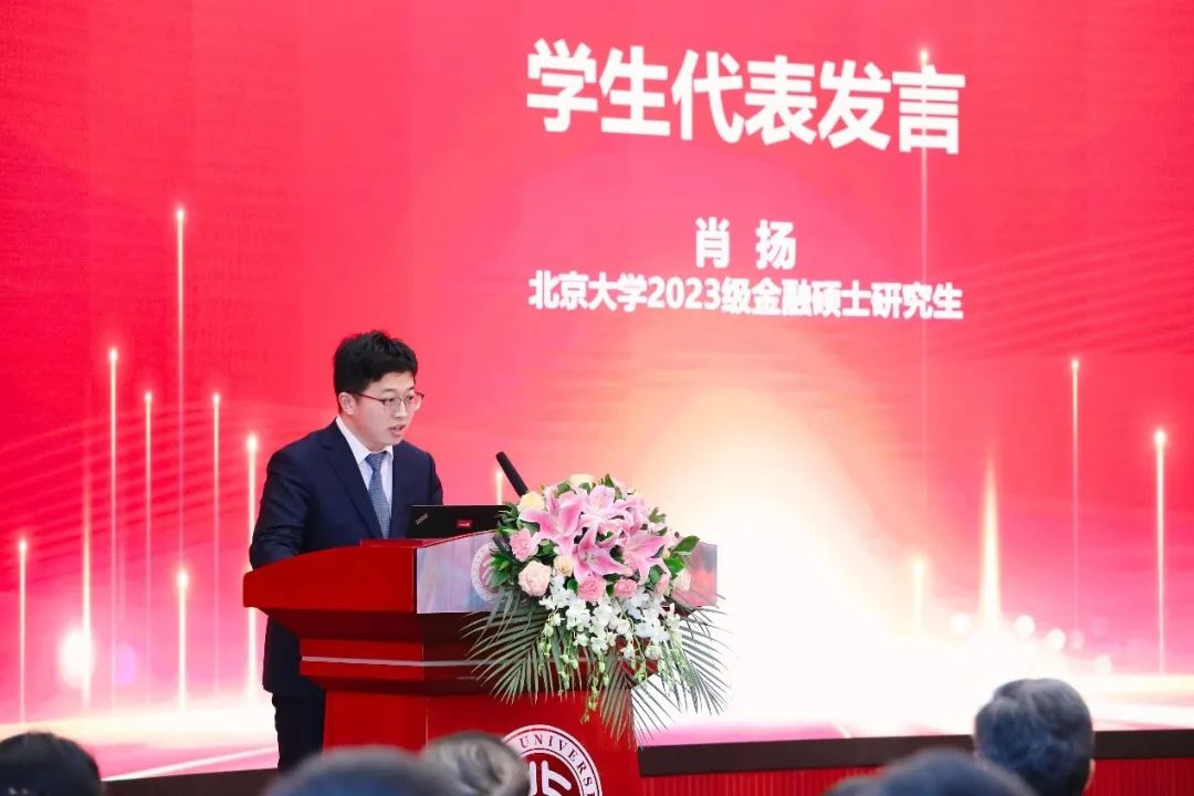 最后,2023级金融硕士肖扬作为学生代表发言。他用“问渠那得清如许,为有源头活水来”“好风凭借力,送我上青云”“同声相应,同气相求”三句话分别表达了对学院、导师的感谢和对同学的勉励。肖扬代表专硕学生表示,将永葆学术追求、牢记实干兴邦。
