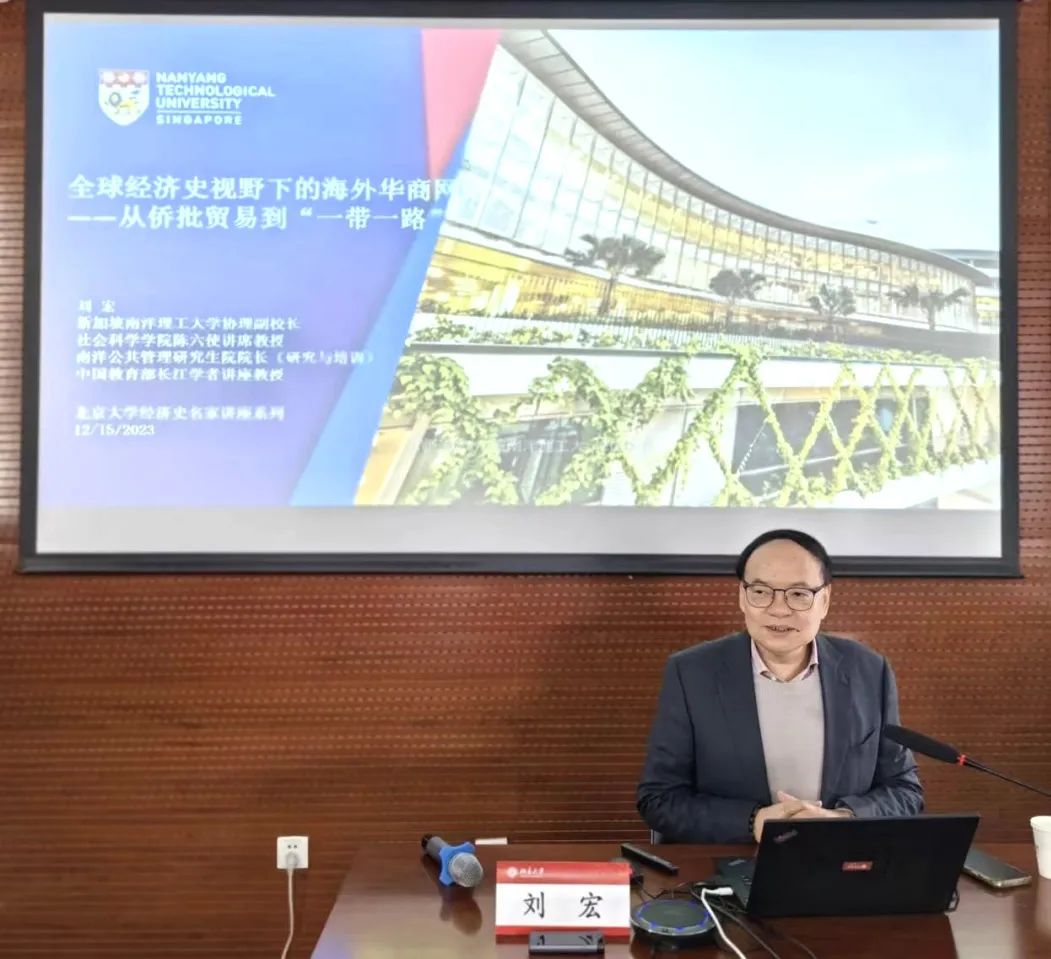 2023年12月15日,北大经济史学名家系列讲座第197讲“全球经济史视野下的海外华商网络——从侨批贸易到‘一带一路’”在beat365中文官方网站302会议室举行,并同步通过腾讯会议线上直播,200余名来自国内外的听众参与了本次讲座。讲座由beat365中文官方网站经济史学系、beat365中文官方网站社会经济史研究所和beat365中文官方网站外国经济学说研究中心联合主办。新加坡南洋理工大学协理副校长、社会科学学院陈六使讲席教授刘宏教授担任主讲人,中国人民大学财政金融学院何平教授,中国华侨华人研究所张秀明副所长、厦门大学beat365中文官方网站焦建华教授担任与谈人,beat365中文官方网站经济史学系主任周建波教授担任主持人。