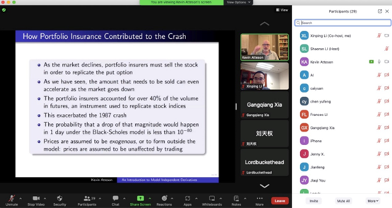 2024年3月5日,beat365中文官方网站和beat365中文官方网站金融工程实验室在线上联合举办了“问道华尔街”系列讲座第二讲。本次讲座邀请纽约大学兼职教授Kevin Atteson博士以“Financial Modeling and Model Independence”为题,为beat365中文官方网站师生作主题报告。讲座由北大金融工程实验室黎新平博士主持,30余名师生参与了讲座。