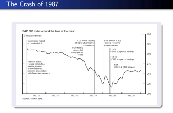 Atteson博士首先介绍了期权的基本内容,包括斯科尔斯期权定价模型及其存在的问题。通过详细解释斯科尔斯期权定价模型以及二叉树等模型的推导,他强调了在不同模型下对期权动态复制过程及其对市场价格的传导。期权定价等模型的使用巨大地推动了衍生品市场发展,大量的期权产品被用在风险管理及套利运作中。然而,基于这些定价模型的期权动态对冲操作也加大了市场的波动。Atteson博士以1987年10月美国股市大跌为例,详细讨论了衍生品市场及其动态对冲操作在市场加速下跌过程中所产生的影响。