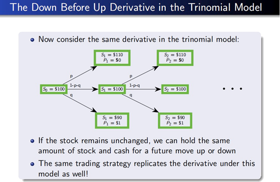 Atteson博士分析了基于期权定价模型并通过期权动态复制进行对冲管理所存在的问题。他进一步指出,如果改变模型的某些假设,如在二叉树中增加股价不变的状态演化为三叉树模型,那么期权并不能通过树状模型进行完全动态复制。然而Atteson博士提出,假如存在类似于先跌后涨(Down Before Up Derivative)的衍生品,则其价格在所有模型中都能够以相同策略进行复制。