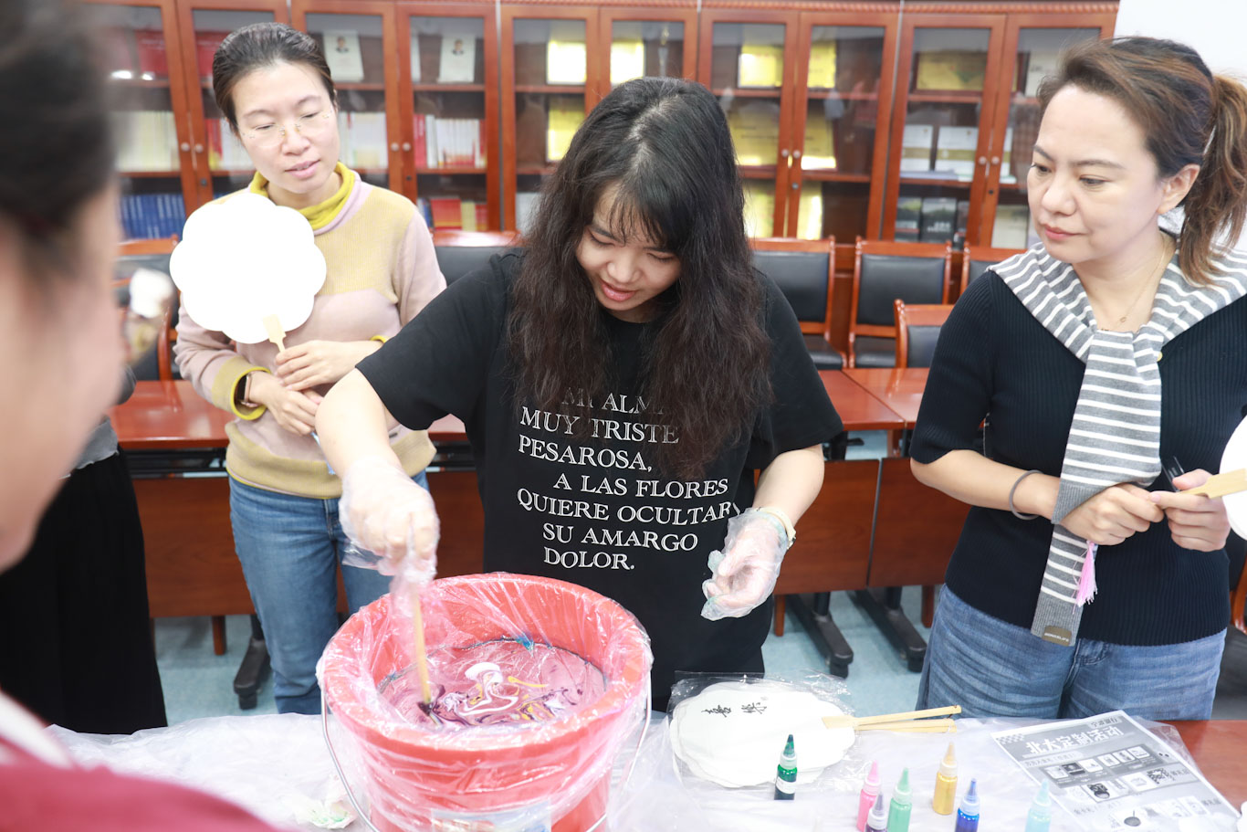 在漆扇活动中,部分老师们围坐一堂,在专业老师的指导下,纷纷拿起工具,挑选心仪的扇骨、搭配色彩斑斓的漆料,开始了一场关于色彩的艺术创作。从挑选扇面底色到设计晕染图案,每一步都充满了仪式感,激发着创造力。在制作过程中,大家互相分享灵感与创作经验,每一把独一无二漆扇作品的“诞生”都赢得了与会教职工的惊叹与赞美。