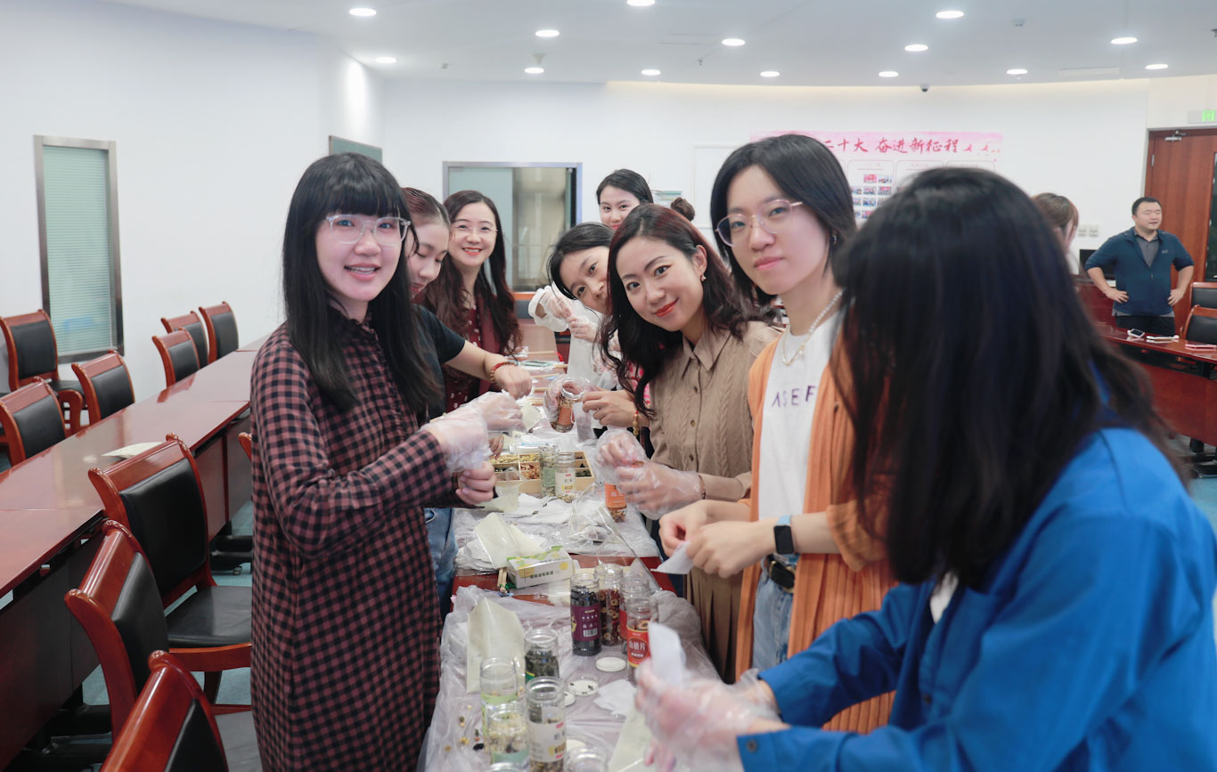 与此同时,部分老师全神贯注地参与着花茶包的制作。大家挑选着胎菊、陈皮、蒲公英、红枣、茉莉花等各色干花与中草药,精心搭配出明目清风茶、养血健脾茶等。一个个精美的花茶包,包含着老师们的搭配巧思与满满心意。