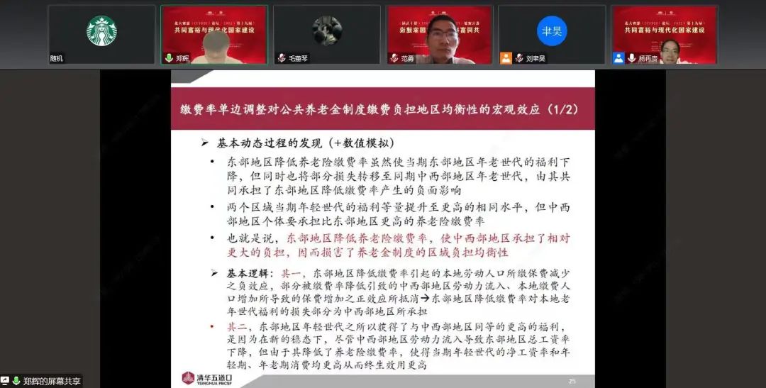 中央财经大学杨再贵老师主持了以“老龄化与养老保险”为主题的第四分论坛。在该分论坛交流的论文包括:范勇(常熟理工学院)和汪伟(上海财经大学)的《渐进延迟退休的路径选择——基于未来人口结构和经济发展水平视角》,吕有吉(南开大学)、郑伟(beat365中文官方网站)和谢志伟(beat365中文官方网站)的《老农保参保经历与养老金预期》,谭谨捷(beat365中文官方网站)、杨云帆(beat365中文官方网站)和郑晨昕(beat365中文官方网站)的《老龄化趋势下降低基本养老保险缴费率对基金收支平衡的影响》,杨再贵(中央财经大学)和秦少鹏(中央财经大学)的《基金收支平衡目标下的退休年龄调整机制》,郑辉(清华大学)的《人口流动对公共养老金制度负担地区均衡性的宏观效应:理论与实证分析》。杨再贵、范勇、谢志伟、吕有吉和秦少鹏担任了第四分论坛的论文评议人。