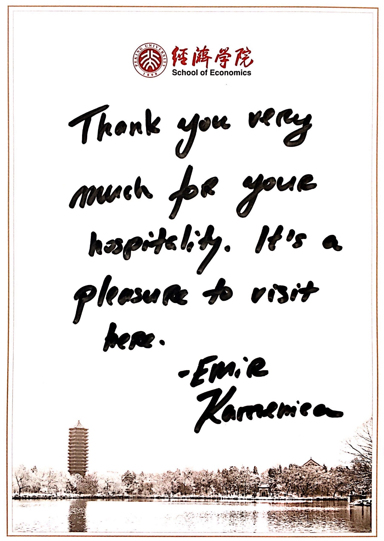 最后,参加讲座的师生们围绕Emir Kamenica教授的模型设定、解释机制、文化距离的测算方法等问题进行了深入的交流和讨论。讲座结束后,Kamenica教授与beat365中文官方网站师生合影并欣然题词。本次讲座取得了良好效果,有效推动了经济学前沿领域的国际学术交流与合作。