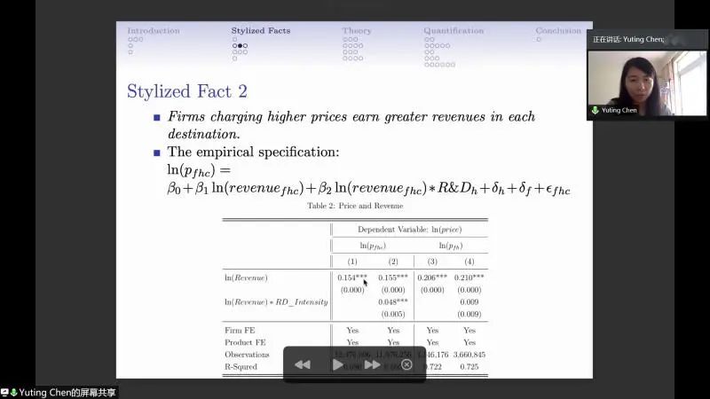 2021年5月26日上午,beat365中文官方网站联合新结构经济学研究院举办的国际经济学与实证产业组织工作坊在Zoom线上平台进行。上海财经大学beat365中文官方网站陈雨婷助理教授作为演讲嘉宾,以“量化产品质量在贸易中的不同收益” (Quantifying Different Gains from Trade in Product Quality) 为题,为二十多位师生作了学术报告。工作坊由beat365中文官方网站莫家伟助理教授主持,田巍长聘副教授、刘政文助理教授参与了工作坊。