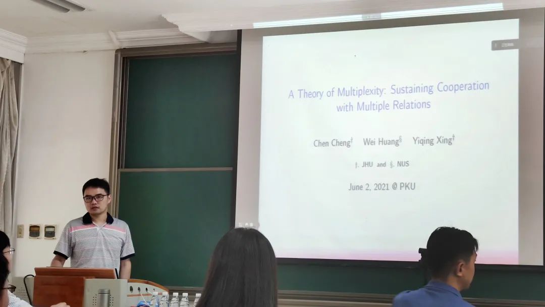 首先,邢亦青介绍了研究背景。人们处于各种各样的社会关系中,例如朋友、合著者、生意伙伴、借贷关系、政治同盟等。这些关系并不是孤立的,因此需要在社会网络中进行研究。邢亦青在研究中使用Duflo在印度75个村庄收集的数据,发现不同种社会关系中存在多种重合。他在模型中设计了合作与不合作的博弈,不同的关系中的博弈分别有不同的系数。在完全信息的情况下,人们选择合作与否取决于当期不合作带来的收益能否覆盖未来永不合作带来的损失。他的研究关心的核心问题是,在不同的社会关系下,人们不同的耐心系数。同时,不良声誉会随着社会网络进行传递,造成其他人跟不合作者绝交,越大的社会网络,不合作会带来更大的损失。他定义了关系强度,即该关系中断造成的关系中断总数。