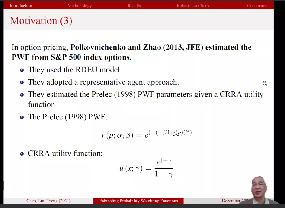 曾郁仁结合自己最近的工作论文,介绍了通过将实物期权价格与随机占优准则下的期权定价边界匹配从而实现估计期权市场中边际投资者概率加权函数的方法。随后,他介绍了论文的写作动机与边际贡献。由于既往文献的估计方法依赖CRRA效用函数假设,而如果不假设市场的完备性,上述方法通常是不合理的。此外,现实中由于信息的不完善,我们可能无法完全了解投资者的效用函数。因此文章采用新的估计方法以放松效用函数假设,在考虑了所有递增和凹效用函数的基础上修补了既往文献的不足。