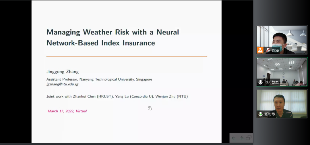 张劲弓助理教授与三校师生分享了他关于天气指数保险的最新工作论文。天气风险对农业生产的影响深远,指数保险是一种有效的对冲工具。但是目前分段线性指数保险合同存在保险赔付和真实损失不一致,即基差风险(basis risk)的问题,导致农户对指数保险不信任,指数保险的需求较低。文章在有预算约束的农户效用最大化问题中嵌入神经网络方法,提出了一种基于神经网络的指数保险设计框架。这种方法有效地捕捉了天气指数的高维、非线性、非单调信息,使得指数保险赔付和农户的损失成正相关关系。接着,文章利用美国伊利诺伊州气象数据,内生性地求解了最优保费和最优需求。结果显示,该方法降低了基差风险和保险费用,从而提高了农户的效用。此外,文章还做了一些有益的拓展,包括将保产量变为保收入、将该保险产品卖到相邻州、将优化问题变为优化尾部风险等,在这些拓展案例中,该方法仍明显优于现行指数保险。
