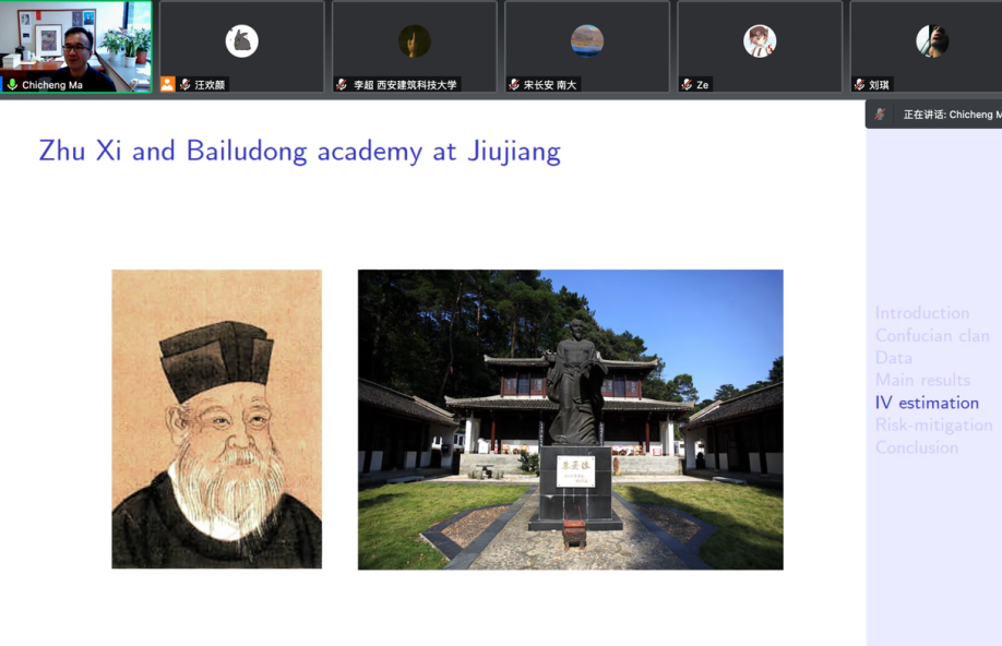 接下来,马驰骋展示了数据来源和基本的回归结果。通过收集各地区历史上编纂的家谱数目和人口密度等数据,他们发现宗族的强度确实能显著地提高地方的人口密度,并且在控制了地理因素、气候条件、新世界粮食作物引进等方面的影响后结果依然稳健。为了解决宗族强度这一变量可能存在的内生性问题,马驰骋重点介绍了工具变量的选取过程。宋朝时由朱熹所创立和宣扬的理学成为宗族组织制度化和向基层扩散的关键一环。因此,他们采用各地方到最近朱熹曾经讲学的书院的距离作为工具变量进行进一步分析。结果显示,宗族强度依然能显著地正向影响地方人口密度。