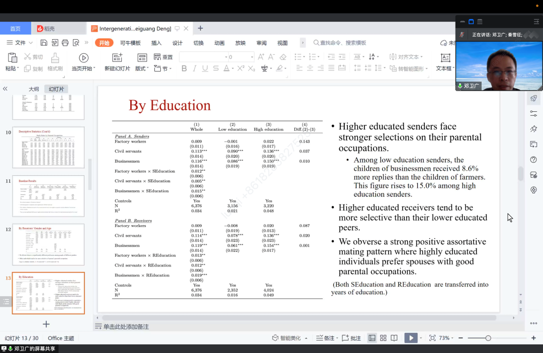 邓卫广教授基于国内最大的线上婚恋交友平台,设置了不同特征的虚拟交友对象,随机向活跃平台用户发送信息,根据用户回复情况估计了父母特征对于婚姻匹配的因果效应,并讨论了其关于不同收入、受教育程度和兄弟姐妹数量的异质性。结论在采用固定效应模型和排除伪回归后依然保持稳健。最后,进一步开展了线上调查数据,以分析个体的行为动机。