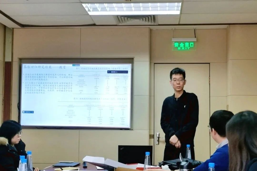 随后,吕泽众作汇报。他和指导老师使用1950-2008年中国30个省、自治区、直辖市,跨度58年的宏观面板数据,通过构建固定效应模型和双重差分模型探究了新中国成立后各地区疟疾疫情对人力资本积累的作用。研究发现疟疾疫病的流行对当地人口增长具有显著的负面影响。疟疾疫情越严重的地区,人口总数越少,年自然增长率越低。同样,疟疾疾病对地区就业和教育也存在负面影响,地区就业人数和中小学在读人数在疟疾发病率越高的地区越低。此外,他们比较了20世纪60年代和80年代两次疟疾防治政策的效果,发现由于60年代社会动荡管理不佳,导致1964年防疫政策并未发挥应有作用,而由于改革开放后社会稳定,体系完善,1986年防疫政策取得了优异的效果。与会老师就数据来源、变量衡量方法、研究目标、因果识别策略等方面对该研究给出了详实的指导建议。