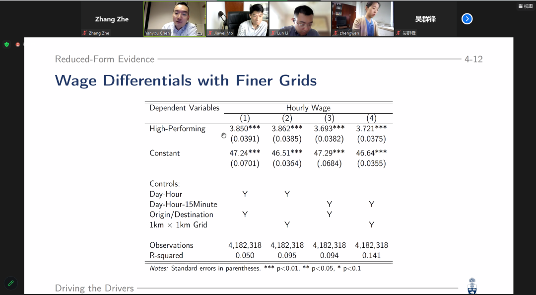 Zheng Song教授在讲座中介绍了量化交通网络投资的收益,其中驾驶时间对交通的弹性(“拥堵弹性”)可能因道路而异。他使用来自50万辆中国卡车的高频GPS数据来测量交通流量,并揭示中国城市间道路连接的拥堵弹性异质性。结果发现34%的链接不拥塞,28%的链接弹性小。相比之下,使用英格兰高速公路的实时交通数据,Zheng Song教授发现几乎所有高速公路都与较大的拥堵弹性相关。接下来,他将拥堵弹性异质性纳入具有最佳路线选择的定量一般均衡贸易模型,并在结构上估计该模型。Zheng Song教授指出中国的回报高度不平等,拥堵弹性的异质性可以解释一半以上的离差。这一研究结果表明,中国的公路投资存在错配。