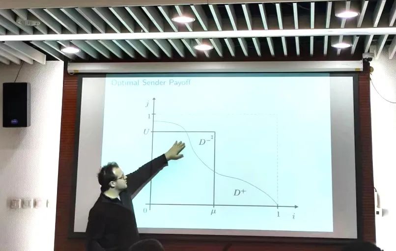 在本次报告中,Carl Heese分享了有关连续集上说服博弈的研究。关于说服博弈的传统研究往往只关注信息接受者离散分布的情况,而本研究则考虑了信息接受者在区间上连续分布的情形。模型的基本设定为一个信息发送者和一个连续集的信息接受者,信息发送者的策略集则为二元状态、信息接受者、实现值到连续区间信息的映射。在具体的分析之前,Carl Heese首先讲解了几个现实中的例子,包括简单多数投票、推销员业绩考核、合作生产等。随后,他对信息发送者的效用函数作了一系列假设,并定义了信息接受者的可行策略集。通过函数变换,Carl Heese演示了如何在给定实现值分布的情况下最大化信息发送者的收益。对于比较静态分析,他证明了F均值保留展开式下,发送者最大收益小于分布为F下的情况。最后,Carl Heese将本研究与已有文献进行联系与比较,并讲解了模型可能的拓展延伸。