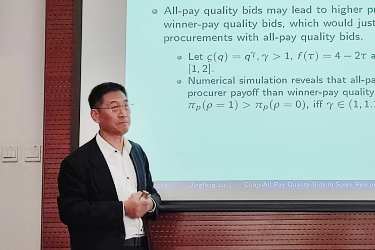 在本次报告中,Jingfeng Lu分享了在计分采购拍卖中全支付质量投标的研究。在计分采购拍卖中,采购商依据质量和价格设定一个计分方式。供应商有不同的类型,且类型为他的私人信息,高类型的供应商面临高生产成本。供应商汇报其质量与价格,最终分数最高者赢得拍卖。已有文献大多假定输掉拍卖的供应商无需进行支付,而他则放松了这一限制,假定输掉拍卖的供应商需要按所投标的质量,以某一比例支付相应的生产成本。接下来,Jingfeng Lu对模型进行推导,发现全支付的特性会激励供应商提供较低的质量以规避失败风险,但对采购商收益的影响方向不确定。如果采购商选择对供应商需要支付的生产成本进行补偿,那么供应商将会提供更高质量的产品,并且得到更高的收益,但这以采购商收益和社会总剩余下降为代价。最后,他求解了采购商的最优计分方式,这一计分方式是拟线性的。