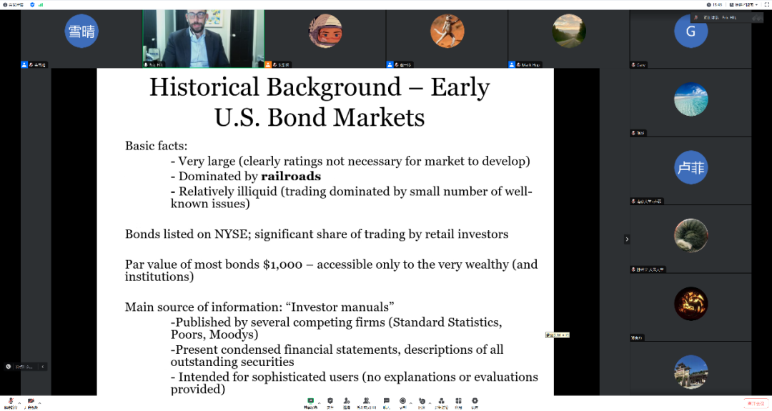 在实证分析之前,Eric Hilt介绍了历史背景。在引入信用评级之前,投资者的信息主要来自一些投资者手册,这些手册只是简单介绍了公司的财务报表,没有任何辅助散户投资者评估的信息。制作其中一本手册的John Moody在1909年推出了他的第一本评级手册,并且不刊登任何广告。此后,其他公司也开始按照字母评级标准发布评级,金融监管机构也逐渐应用评级。