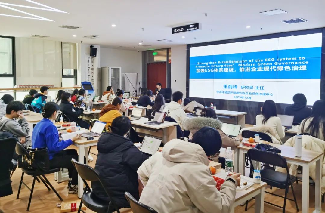首先,董战峰对企业ESG进行了简要介绍,强调了加强ESG体系建设对国家宏观层面的高质量发展和企业层面的现代化绿色治理的重要推动作用。接着,他从“ESG是中国式现代化建设的重要实践”“积极探索ESG推进现代绿色治理”“加快推动中国ESG体系建设”三个维度出发,带来了一场角度丰富、内容翔实的ESG主题讲座。