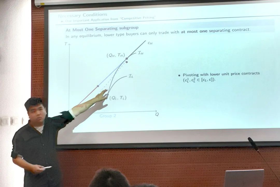 黄大康分享了关于市场结构与逆向选择的报告。他从完全排他和非排他两种情形出发,介绍了目前有关最优合约的研究。之后,黄大康引入了更为一般的市场结构,通过刻买者可以与之交易的卖者的子集,将完全排他和非排他的情形包括在内,并在此框架下研究市场均衡的通解。随后,他证明了介于中间的“混同 +分离”均衡的存在,此种均衡可以实现对于低风险卖者的分离,并且可以解决过度配给的问题。黄大康单独分析了卖者被分为两个组的“1+1”市场均衡,并证明任何“混同+分离”的分配结果都可以在此情况下达成均衡。最后,他证明了“混同+分离”均衡的稳定性,并介绍了该框架可能的拓展。