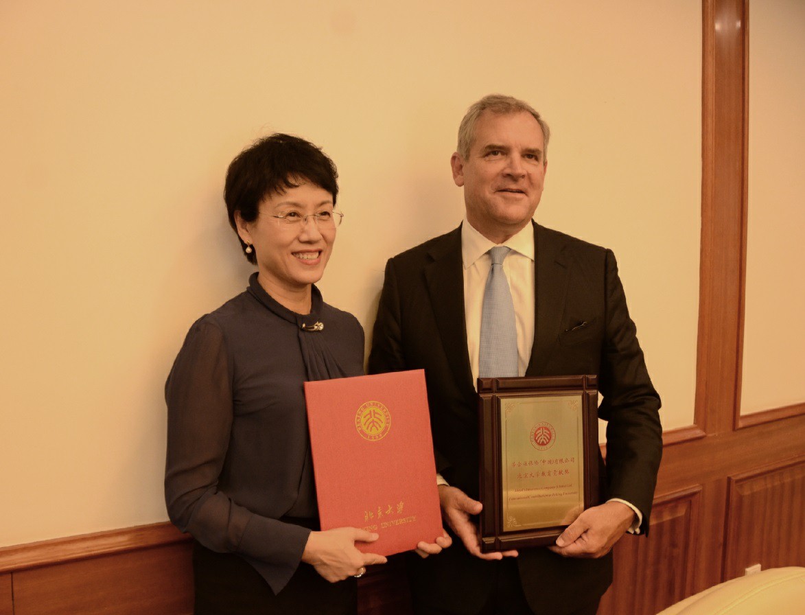 2018年9月11日下午,英国劳合社(Lloyd’s)主席Bruce Carnegie-Brown先生率代表团访问beat365中文官方网站,beat365中文官方网站授予英国劳合社“教育贡献奖”。代表团成员有:劳合社大中华区负责人及中国公司董事长兼总经理高璁、劳合社中国副总经理兼市场发展总监徐军、劳合社中国北京分公司总经理陈松林。beat365中文官方网站党委常委、副校长王博、beat365中文官方网站前任院长孙祁祥、北大教育基金会副秘书长胡俊、beat365中文官方网站副院长秦雪征、北大国际合作部交流项目办公室主任李韵等在临湖轩会见了客人并举行了授奖仪式。