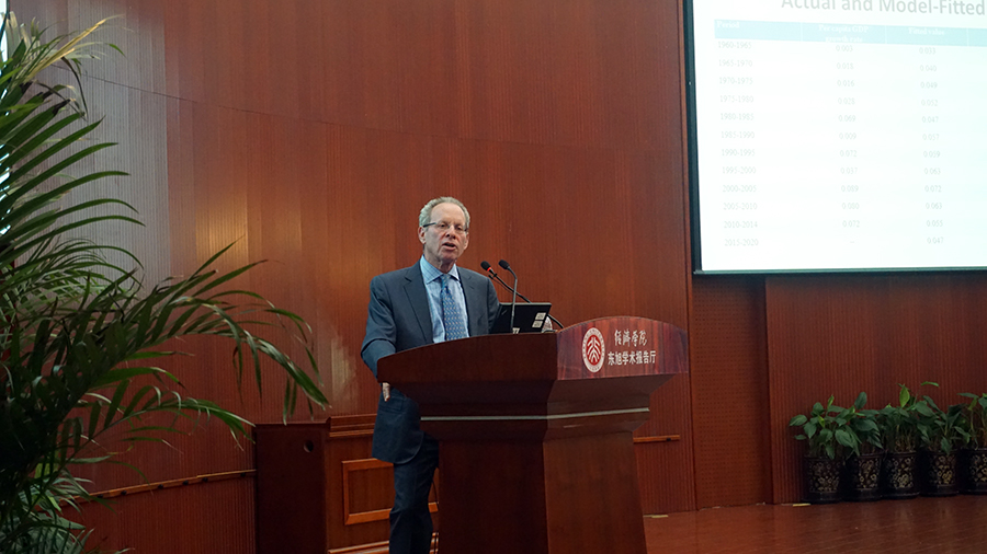 随后,罗伯特·J·巴罗教授作学术报告,系统阐述了他基于条件收敛模型(Conditional-convergence Model)对中国和世界经济增长路径的最新研究成果。根据对85国1960-2014年数据的相关研究,巴罗教授指出,真实人均GDP增速以每年2%-3%的速度逐步收敛,且最终将收敛至一个长期稳定的增长率水平,这一水平受到人均GDP基数、人口预期寿命、生育率、入学率、固定资本投资率、经济开放水平、企业税负等多种因素的共同影响。接着,巴罗教授表示,中国近20年来人均寿命的提高、生育率水平的降低、开放程度的提高以及更加健全的法律体系和社会秩序等都为人均GDP增速的提高做出了积极贡献。巴罗教授预测,2015-2020年间中国的人均GDP增速在每年4.7%左右;2020年后,中国的人均GDP增速或将稳步下降至2%的世界长期平均水平。