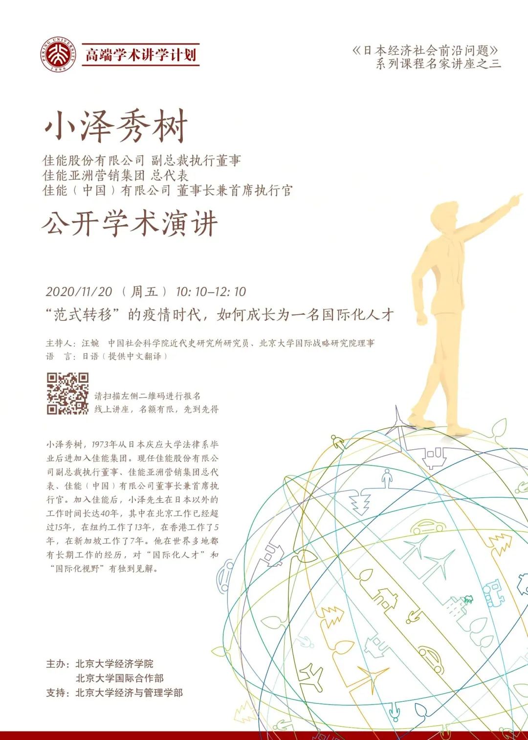 “日本名家系列讲座”第一讲和第二讲已分别于10月23日、11月6日通过线上方式进行,受到了师生的广泛好评和热烈反响。讲座第三讲主题为“‘范式转移’的疫情时代,如何成长为一名国际化人才”,将于11月20日10:10-12:10在WebEx平台上进行。报名通道现已开启,请快来报名吧!