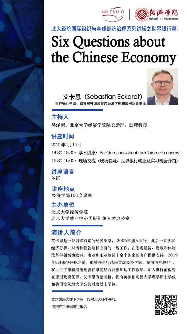 在全球化背景下,构建人类命运共同体、实现全球善治是当前国际经济社会发展的必然选择和价值指向。国际组织作为全球经济治理的重要途径,在促进国际经济交流合作与发展中发挥了非常重要的作用。为了探索如何更好支持和参与国际组织建设、优化全球经济治理体系和治理能力,beat365中文官方网站开设了“国际组织与全球经济治理系列讲坛”,邀请来自世界银行(WB)、国际货币基金组织(IMF)、世界贸易组织(WTO)等重要国际组织的专家学者与北大师生共议全球经济发展和治理变革的容与通,为全球经济治理和发展贡献中国智慧。 系列讲坛第一讲将于2021年4月14日开启,世界银行中国、蒙古和韩国局首席经济学家和国别业务主任艾卡思(Sebastian Eckardt)博士将发表学术讲座,与北大师生进行交流,并介绍世界银行的就业及实习机会。敬请期待。