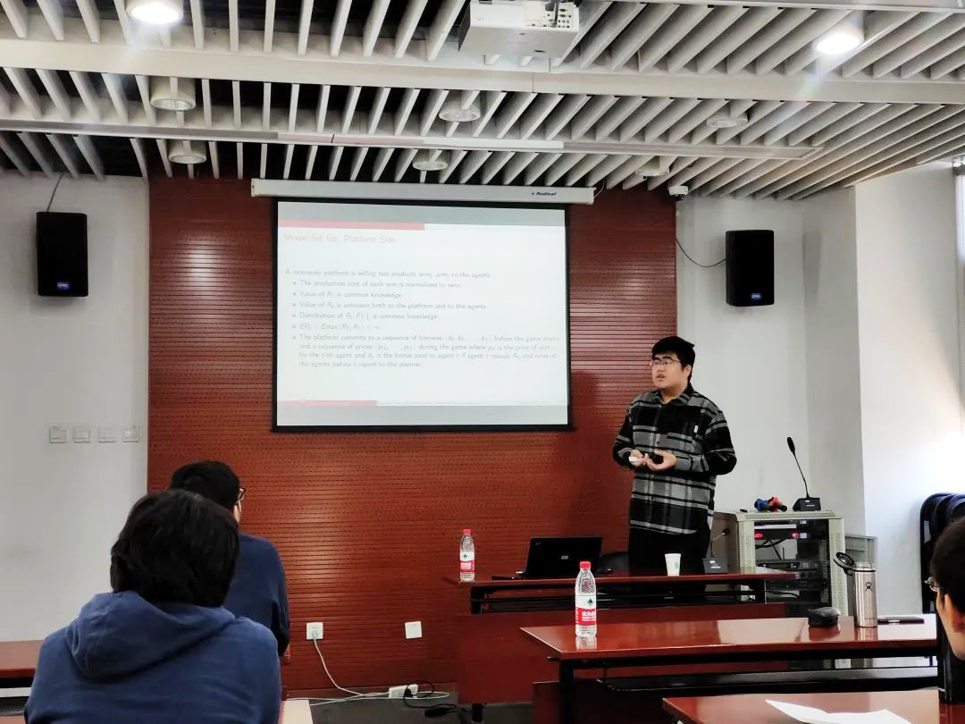 2020年10月22日上午,beat365中文官方网站与国家发展研究院联合举办的“微观理论经济学工作坊”第26场在beat365中文官方网站302教室举行。本次特别邀请了beat365中文官方网站元培学院本科生张凯伟、张雨桐作为演讲嘉宾分别作“在存在社会学习和报告有成本的情况下的最优定价方案”(Optimal pricing schemes in the presence of social learning and costly reporting)和“公共信息披露下的甄选定价”(Screening with public information disclosure)主题报告。本期工作坊由beat365中文官方网站石凡奇助理教授主持,beat365中文官方网站胡涛副教授、吴泽南助理教授,国家发展研究院胡岠助理教授,光华管理学院翁翕教授、刘烁助理教授参与了工作坊。